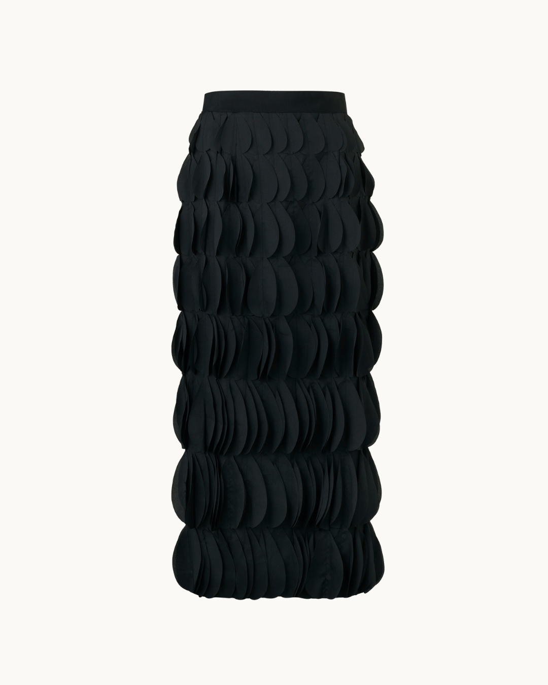 The Bowery Top is crafted from layers of scallop shaped crepe that create movement and intrigue. Architectural and cut for a relaxed slightly cropped fit, a simple round neckline that ties at the back and short, wide sleeves.