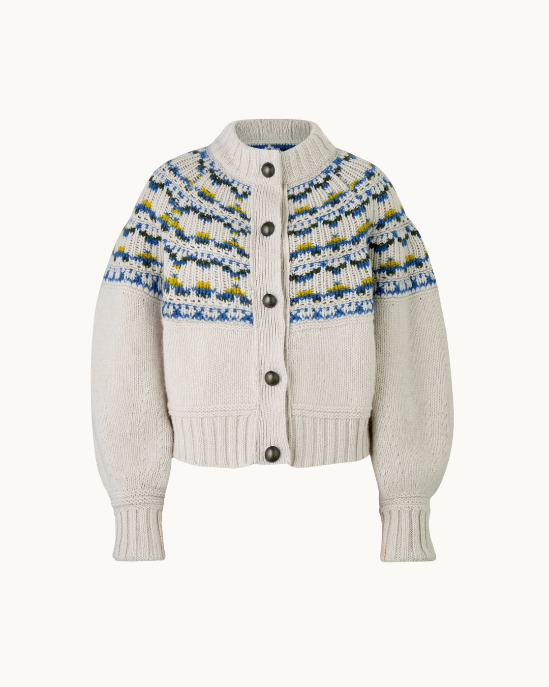 A cosy statement-maker. Knitted from pure Scottish Lambswoolsourced from the finest mill in Scotland and washed in the surrounding peaty lochs for warmth and softness. Its chunky knit and bold fair-isle inspired pattern in blue, yellow, and green bring a touch of alpine charm, while the slightly cropped shape and voluminous sleeves feel fresh and modern.