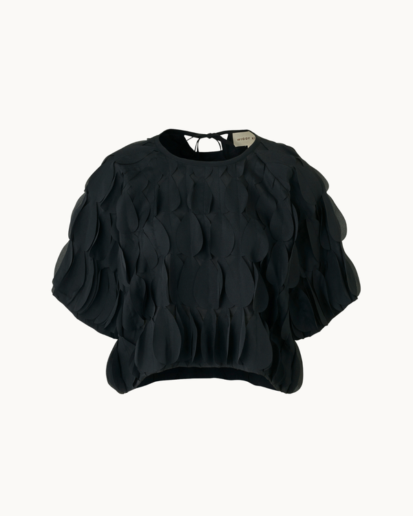 The Bowery Top is crafted from layers of scallop shaped crepe that create movement and intrigue. Architectural and cut for a relaxed slightly cropped fit, a simple round neckline that ties at the back and short, wide sleeves.