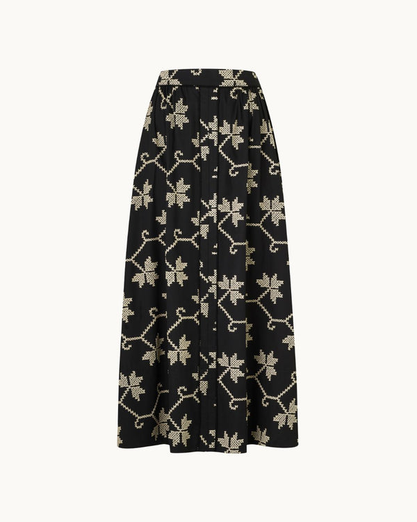 The Agatha Skirt is an elegant fusion of eastern influences and sumptuous decadence. Designed with a flattering high waist, it features intricate side detailing, frogging appliqué and a side split for ease of movement and a touch of allure.