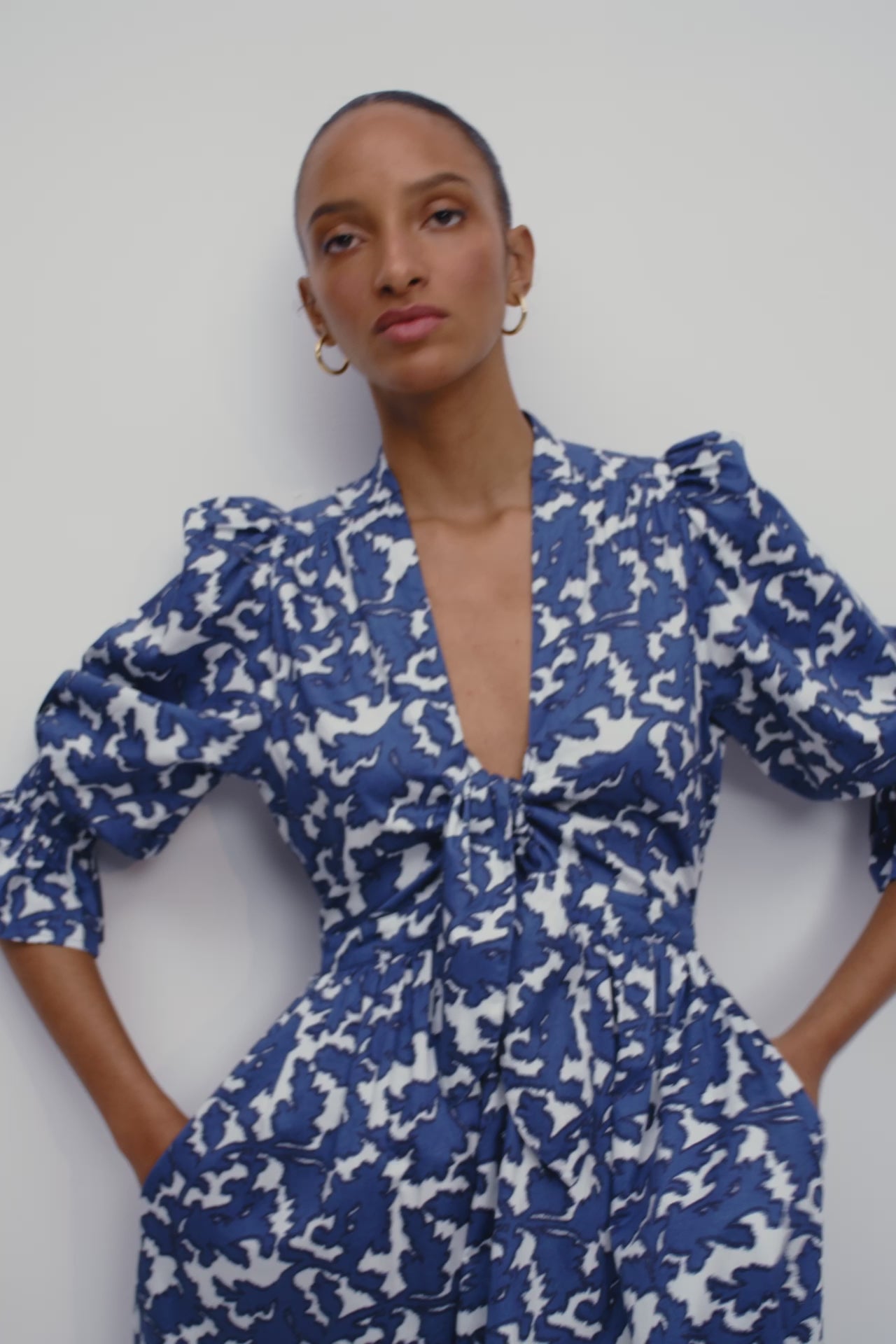 The Bunny Dress is playful and feminine. Puff shoulders, deep neckline and artfully considered tie at the bust which both conceals, yet reveals just enough. A bra can indeed be worn should you wish: the tie adjusts the dress to fit across the bust. Our vintage blue print (from an Haute Couture Parisian House)is beautiful in this midi-dress that falls to low calf which makes this a dress to take you seamlessly from day to evening.