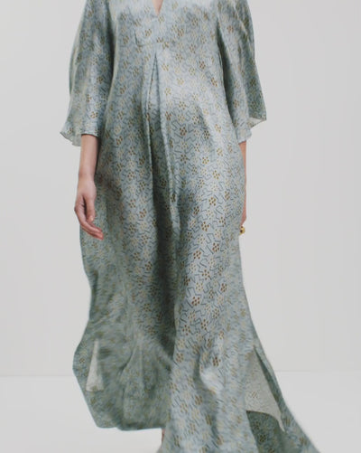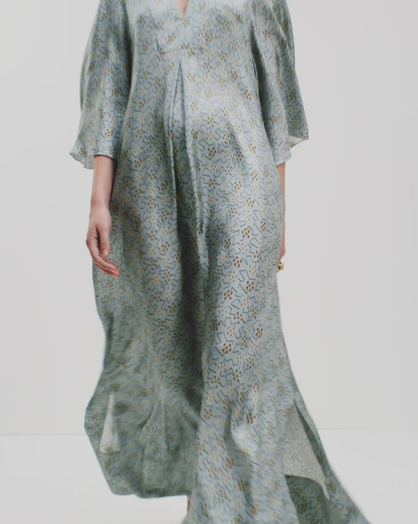 The Jackie Dress is a beautiful sleek and minimal silhouette, elevated through a delicate Bohdi Print is pale blue sun-washed tones in sumptuous silk twill. Wear it loose or use the optional corded self belt to create a softly defined waist.