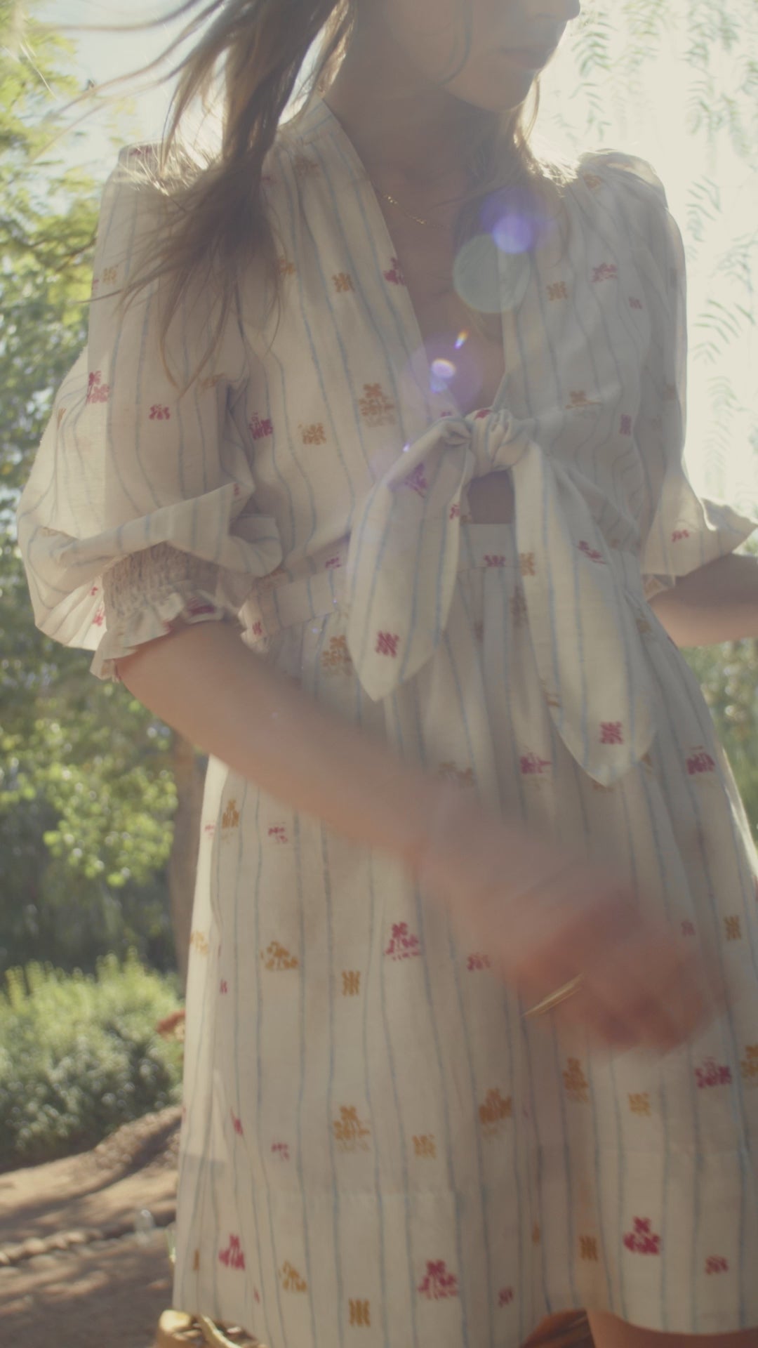 The Mini Bunny Dress is playful and feminine. Puff shoulders, deep v-neck and artfully considered ties conceals, yet reveals just enough. A bra can indeed be worn should you wish and the tie adjusts to fit across the bust.