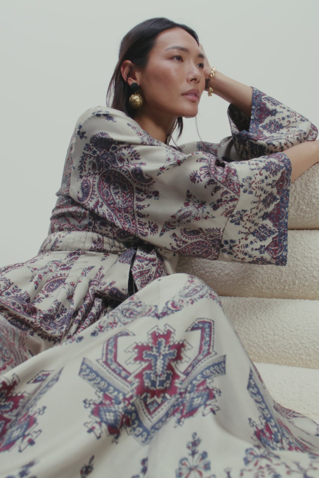 The Paloma Dress is an ode to effortless elegance, cut from our beautiful and luxurious silk twill. Our latest striking print has been reimagined from a vintage cloth we found that inspired this print and combines rich jewel tones and intricate motifs to create a timeless collectible piece you will love forever. A squared neck-drop with appliqué detailing, nehru collar and deep hem all feature in this design. Wide, kimono-style sleeves and a generous intergrated self-tie belt; it can be worn loose for an easy, bohemian silhouette or cinched for definition. This is an incredibly special dress that is one you will want to pass down.