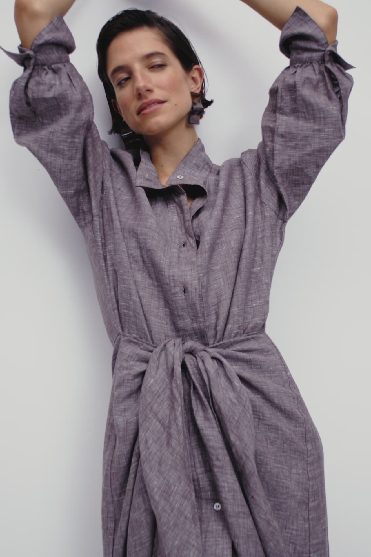 The Sarong Shirt Dress is back again in a beautiful driftwood brown linen. Imagine as if you have tied up and wrapped a shirt around you. It combines both masculine and feminine attributes with its straight collar mans shirt upper with the swathed and sexy integrated sarong. Wear with the cuffs undone or sleeves rolled up, unbuttoned low and with flats. Effortless, easy and so chic.