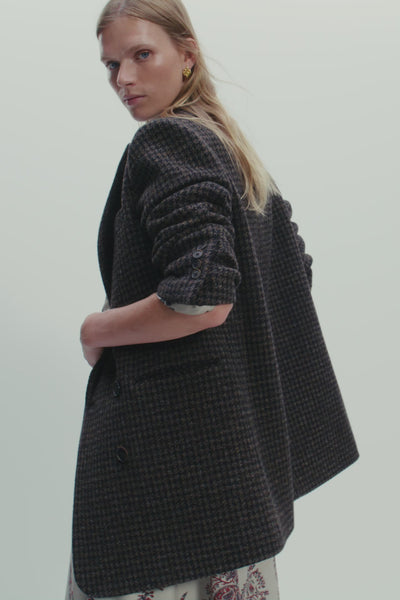 The Beatnik Blazer is the perfect cross between outwear and a blazer, made of brushed camel and black tweed wool and has a lofty, heavyweight feel that offers a lived-in borrowed vibe that works perfectly with everything you already own. Team with a dress, a skirt or your ubiquitous jeans to add a vintage feel and a gentlemen’s aesthetic to any outfit. Belt it with a wide belt our rolled leather belt to cinch in this slightly oversized silhouette.