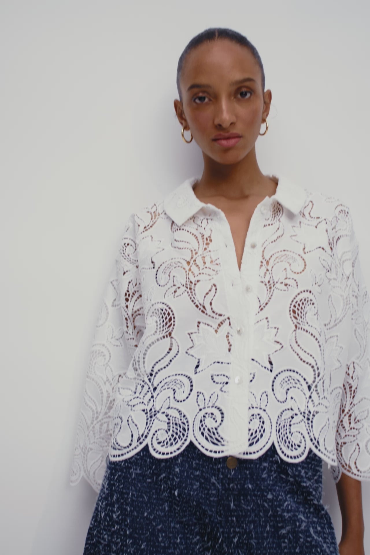 This beautiful cut work shirt is like a piece of art and the perfect foil juxtaposed to denim in the summer. Romantic and feminine with a pretty scalloped hem and edging the on its 3/4 sleeve. Floral and vine motif as cutwork broderie anglaise throughout and a pared-back collar. The prettiest way to show off some skin and feel the breeze.