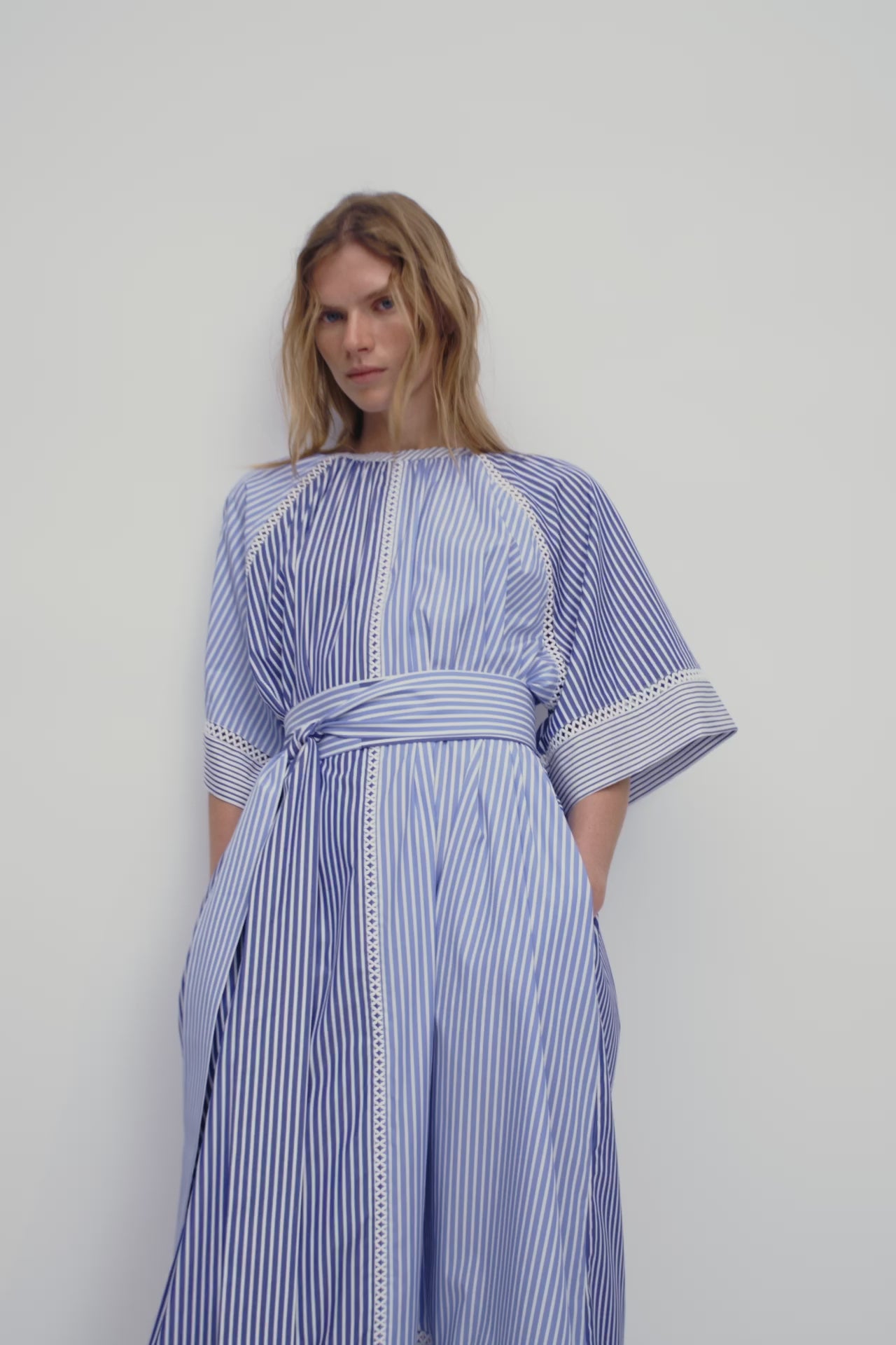 Architectural in shape and made up of clashing but coordinated fresh blue and white shirting stripes and cutout lace, wide elbow sleeves and a throw over construction. Easy, breezy with a Scandi aesthetic. Wear it loose and voluminous or cinch in with its sash belt. Tie it obi-style if you wish or simply at the side in a bow or knot. The essence of summer. Keep it casual or dress it up.