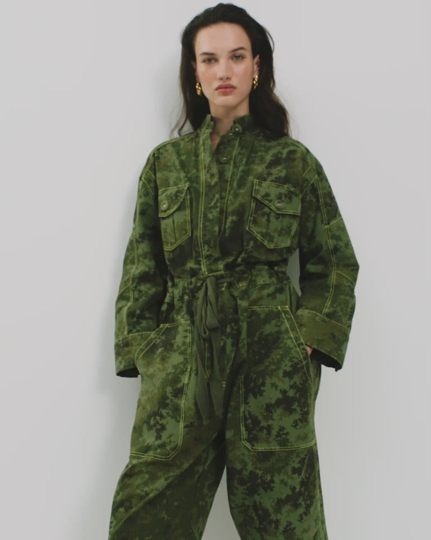 The Dylan Boilersuit is crafted from our signature cotton canvas in heathered camo, echoing our newest Lodge Jacket. An all-in-one piece designed with a relaxed, slouchy silhouette, it balances utility with ease through considered detailing.