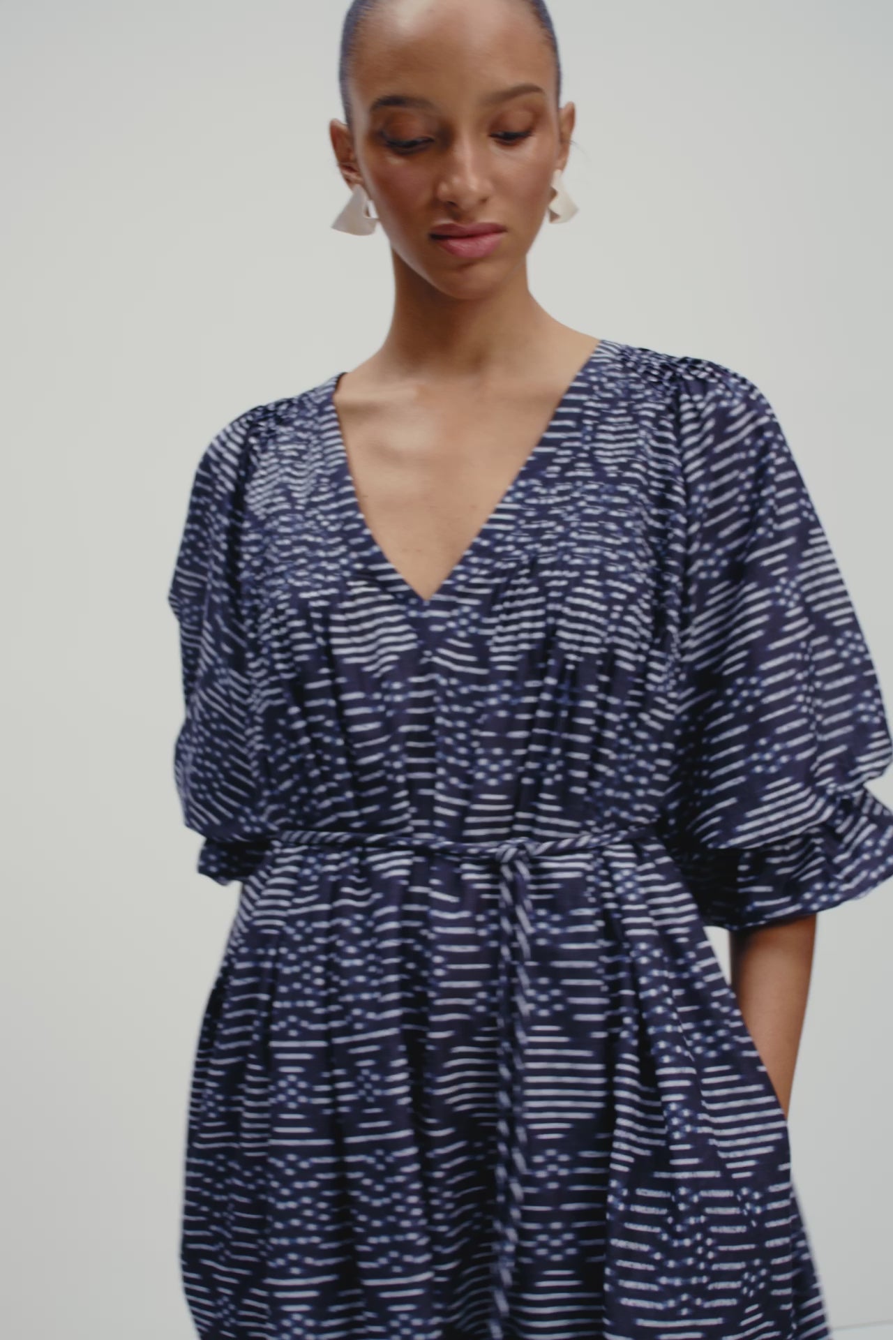 The Folklore Dress is the definition of summer carefree dressing at its finest. Those moments that call for a wafty billowing dress that can be artfully cinched in with its corded belt for more put together moments. Drift from beach to villa, from sundowners to supper. Slip over newly sunblushed skin in this light as air diaphanous silk cotton printed in our own indigo shibori print. Exquisite pleating across the shoulders, glorious sleeves that can be pulled up over the elbows to create a beautiful unique shape. Bohemian and summery.