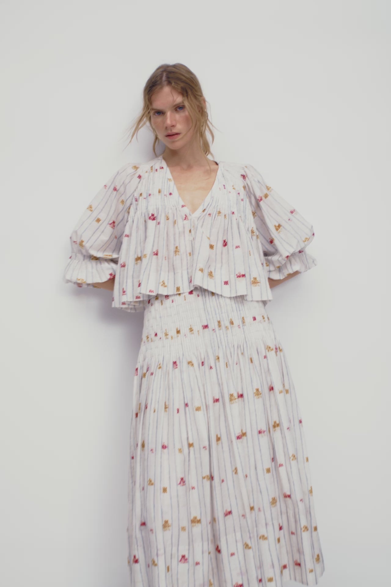 The Folklore Skirt paired with The Folklore Top is the stuff of dreams. Worn together as a set, it makes for the perfect co-ord. Folk inspired printed silk cotton is diaphanous and airy and features printed hand embroidered motifs over a pale blue stripe. Expertly pleated over the waists and hips and falling to 3/4 length and voluminous in shape. Also beautiful when paired with a plain fitted white tee or a tied up white shirt. This is summer in a set.