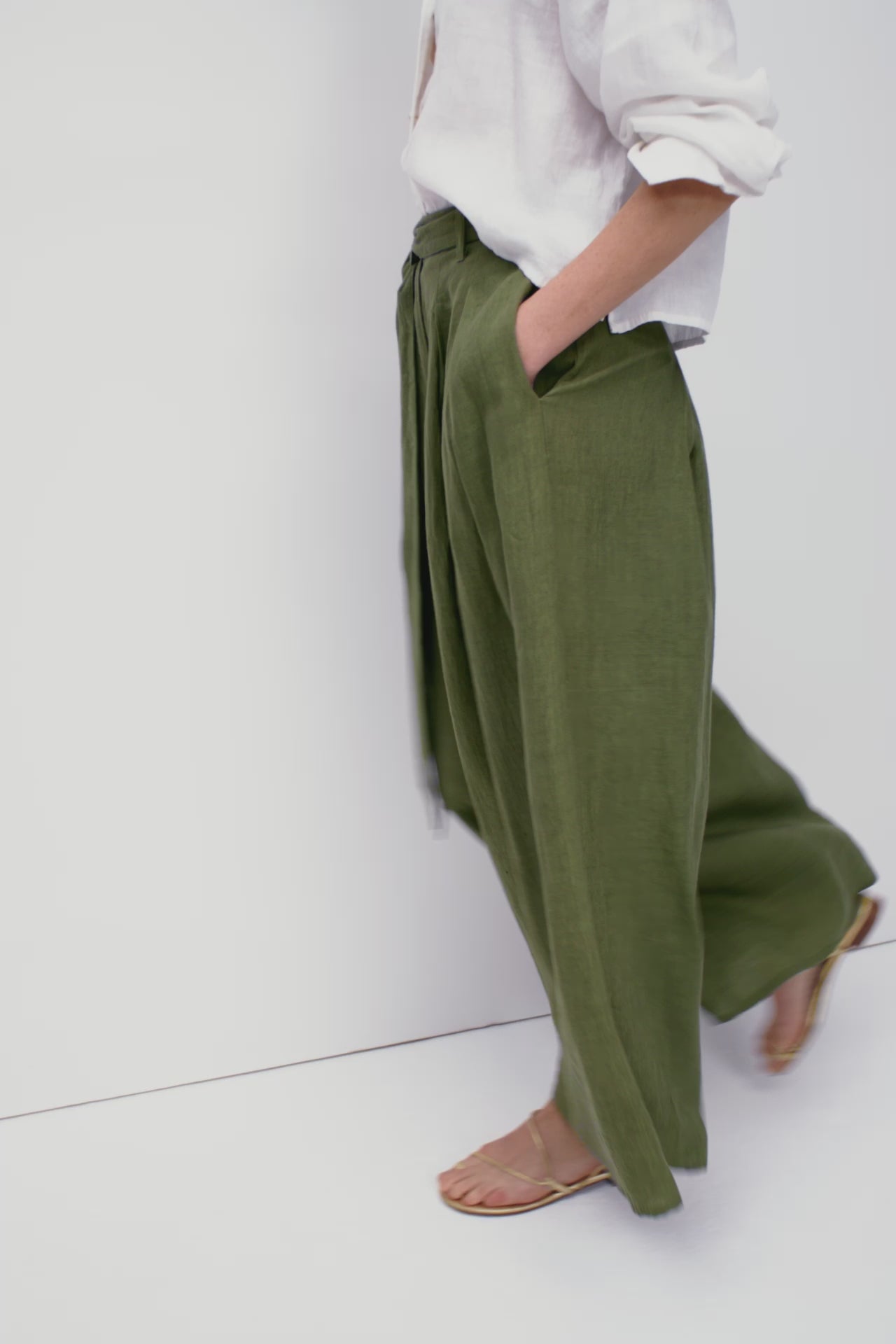These elegant wide leg khaki pants fill that void of a breezy pant for day-to-day wear or for smarter occasions depending how you style them. Fluid and floppy linen, with a high waist, inverted pleats that expertly flatter the figure and pockets. In a washed army green that goes with everything you own. A removable sash belt can be tied up and loosely knotted for a more paper bag style waist or remove for a more traditional, clean waistband.