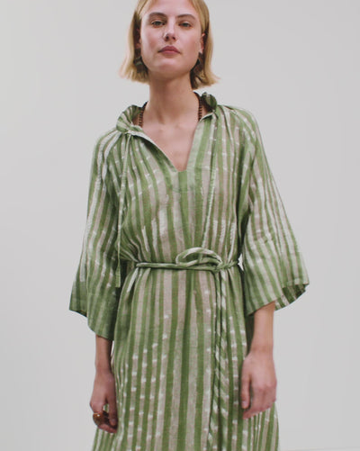 The Keeper Dress moves effortlessly from early spring through the warmer months. Cut in an A-line silhouette that falls to mid-calf, it can be worn loose or defined at the waist with its corded self-belt to shift the shape from relaxed to more structured.