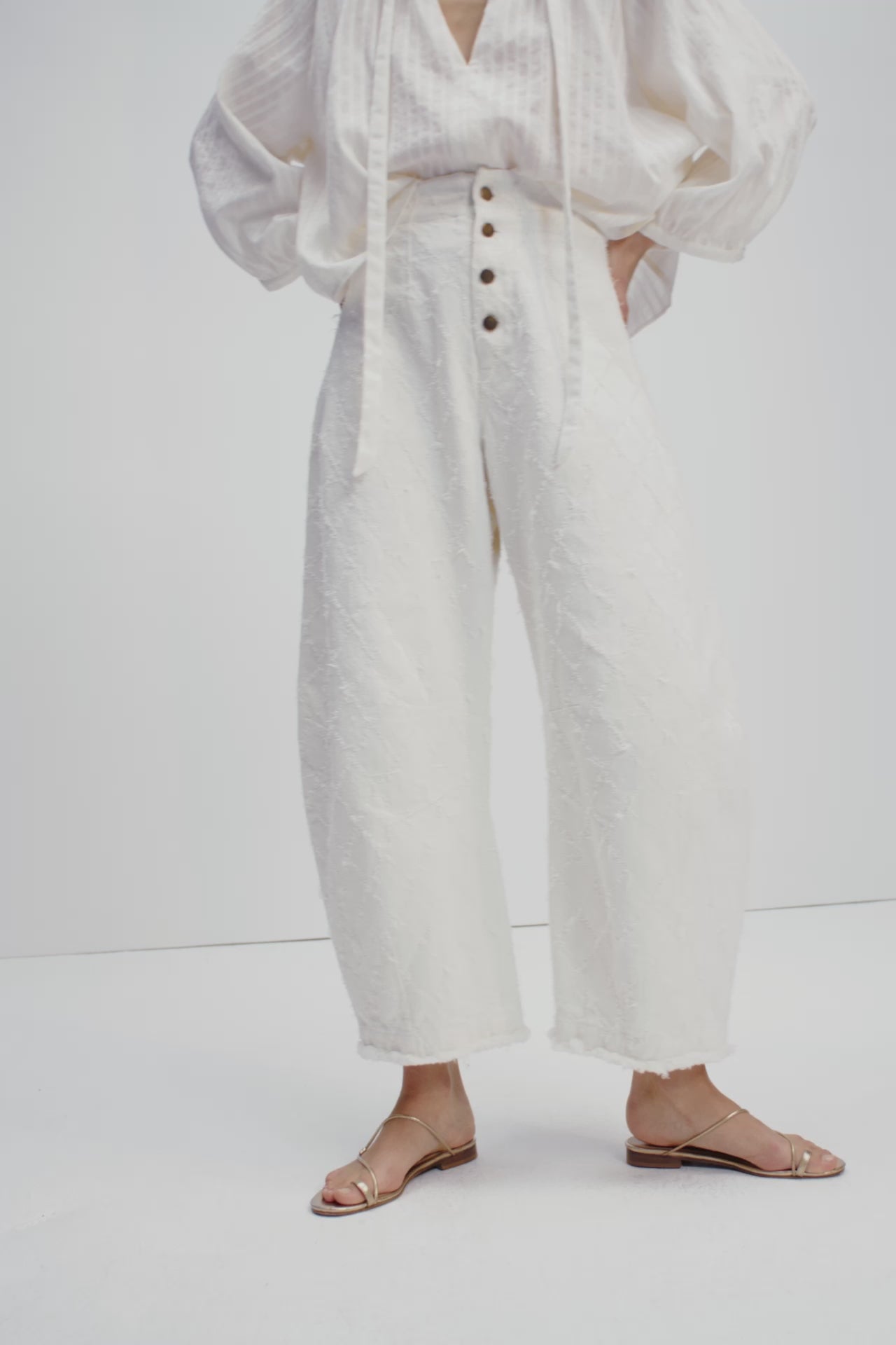 Our Kite Rancher is crafted in a unique argyle frayed jacquard denim in a wear-with-everything ecru. Summery denim doesn’t get better than this. Our spectacular ankle grazing Rancher Jean shape with exposed bronze buttons and adjustable tab fastenings to cinch in the waist. They can be paired back to any of your summer favourites. We love it with our Tito Top for an all ecru look. This piece fits high waisted to slim the hips and exaggerates to a curved leg that is cool and airy. Don’t let this incredible wardrobe staple slip through your fingers.