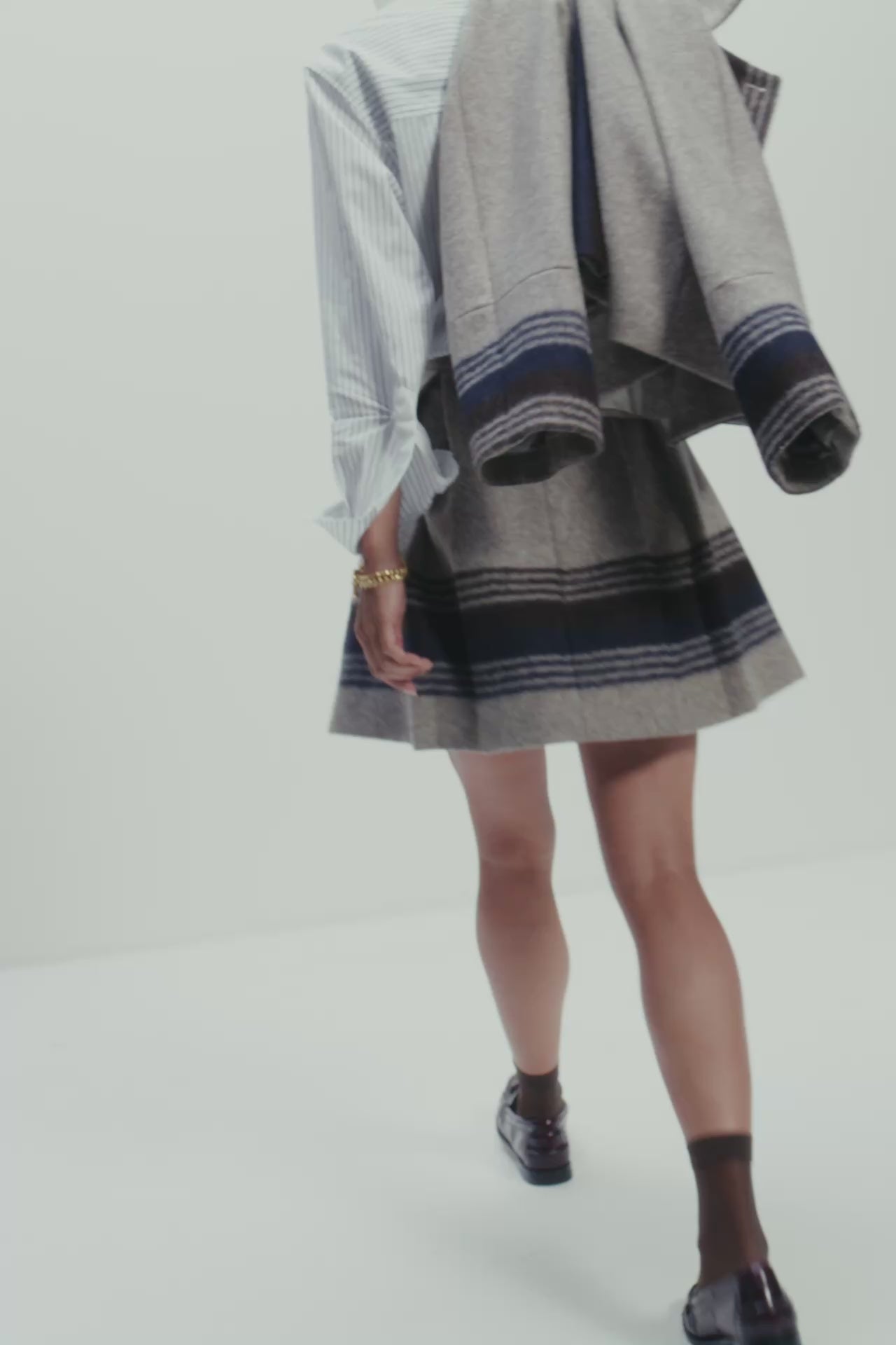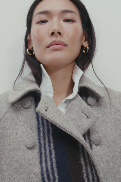 The Mercer Jacket in Our Blanket Stripe is the ultimate throw-on for days and nights that call for understated luxe. Crafted in 100% Italian wool, its neutral base is cut by a deep navy and earthy brown stripe for a timeless, tailored look with a twist. Double-breasted, rounded collar, and covered buttons add a refined finish, while the slightly cropped silhouette makes it perfect over dresses, skirts, or your favourite jeans. Worn back to the matching Theo Skirt it becomes a chic set for winter occasions.