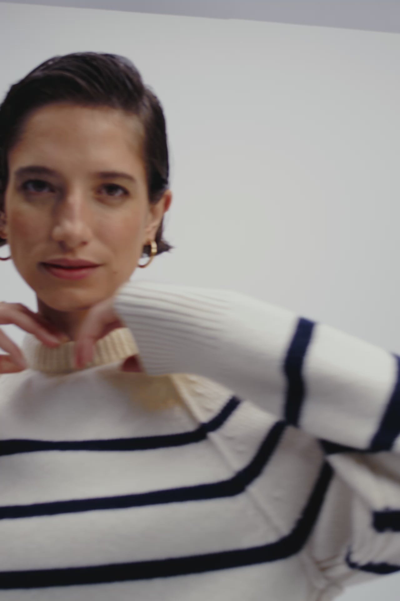The Neat Nora is that perennial knit that crosses seasons and functions with ease. Made from soft and lofty ecru & navy Scottish lambswool - no wardrobe should be without this classic and versatile staple. A foundation piece that combines the perfect proportions of a neat, yet relaxed and slouchy aesthetic that is hard to define. So much cooler and chicer than your average marinière. It has a raglan sleeve with inside-out seam detailing, an effortless silhouette that works just as well with denim as it does with our skirts.