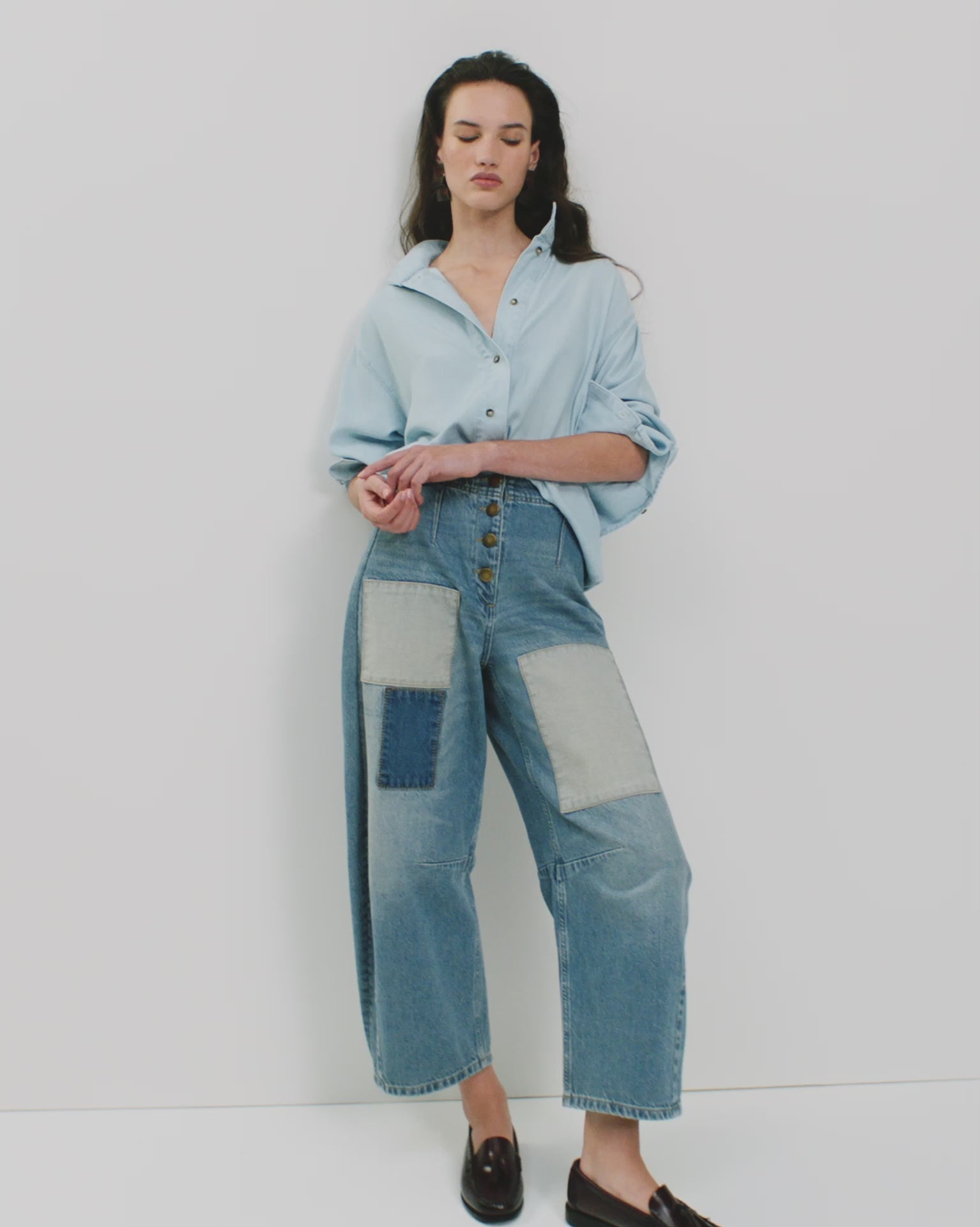 Designed with a flattering high waist and a clean, unfussy silhouette, it features an exposed button fly, shaped darts through the hips and a softly sculpted barrel leg that tapers neatly towards the ankle. Distinctive patchwork denim panels introduce texture and character – an alternative approach to everyday denim that feels thoughtful and enduring.