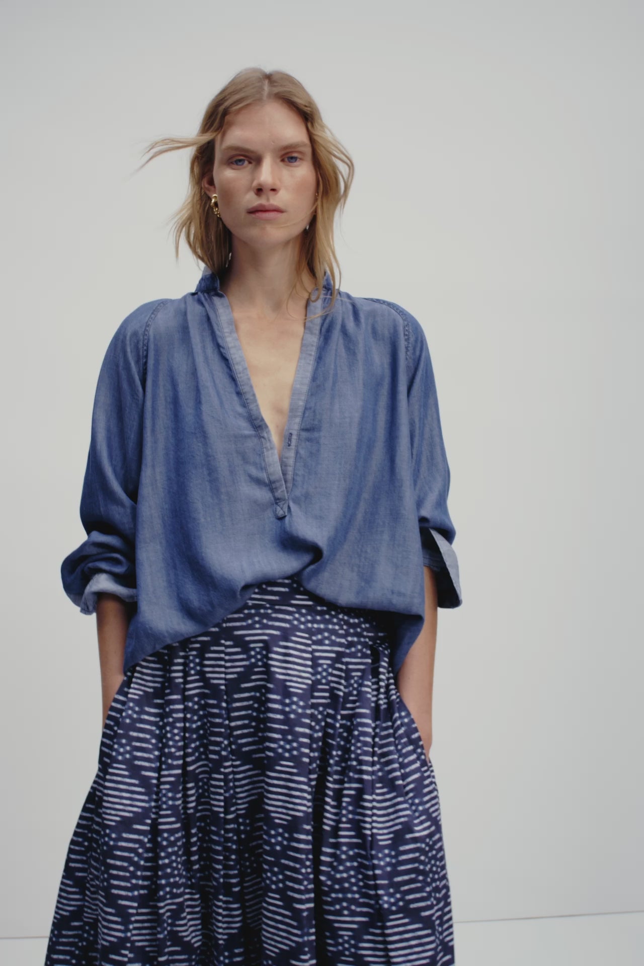 Floppy, foppish and fluid - super drapey and soft tencel denim. Contrasting placket collar and cuffs with a deep neckline with can be worn as open as you wish. A poets style shape with a bohemian and subtly seductive attitude. Languid and loose, can be worn and enjoyed year round. Looks great with our Friday Skirt and indeed any of our separates you may already have stashed in your closet.
