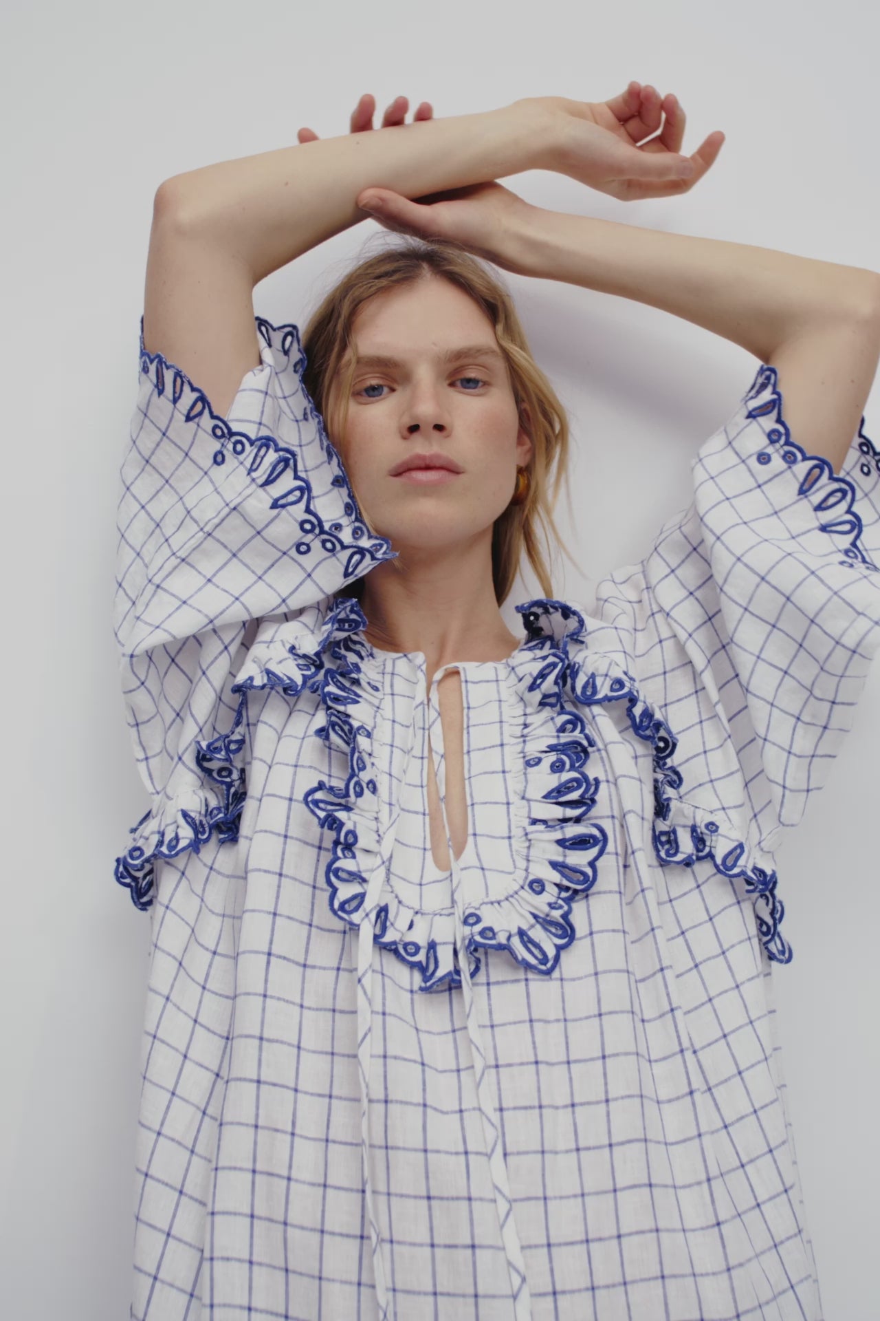 Worn belted or loose, our new Rita Dress is peppered with divine embroidered details, juxtaposing the fresh windowpane checked linen with pretty blue cutwork and a shaped hem, little patch pockets and cuffs on the 3/4 wide sleeves. Bias ruffles tipped in embroidery around the neck drop and inserted in the raglan seams creates a pretty framing for the face. Based on The Maxi Bubble Dress silhouette; it can be worn loose and voluminous or cinched in with the self belt.