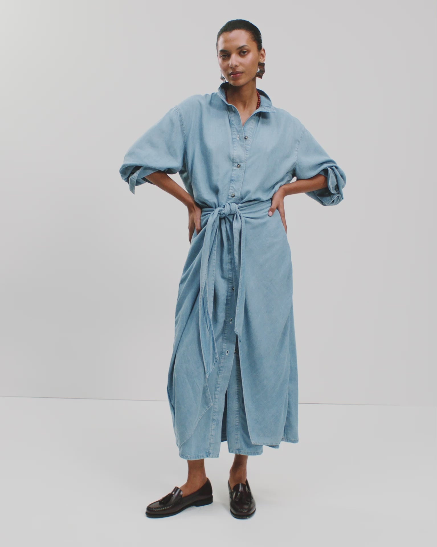 The Sarong Shirt Dress returns, reimagined in soft, lightweight denim Tencel for an easy, wearable interpretation of this signature silhouette.
