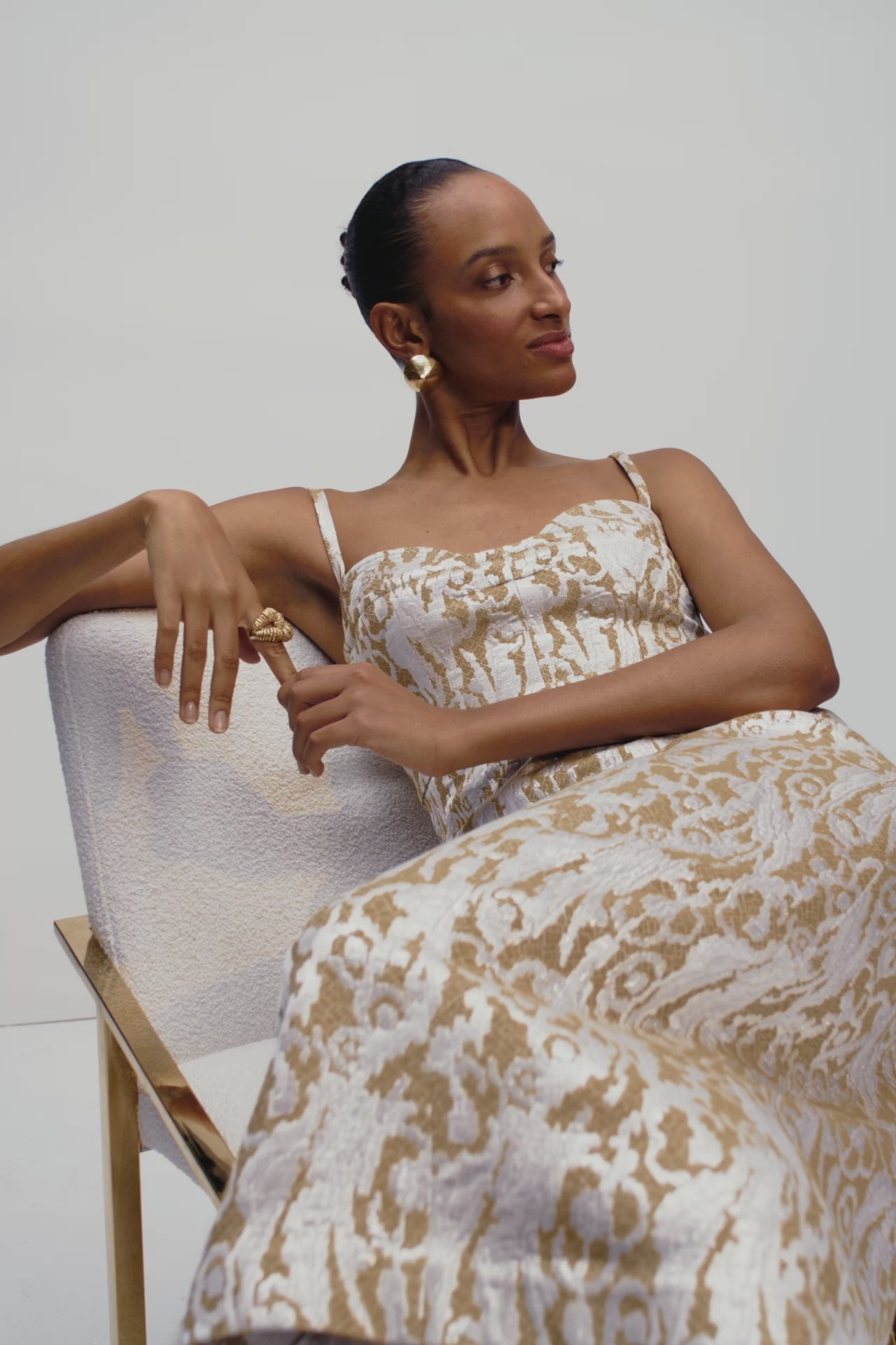 The Sicily Dress cloth was developed for us by a specialist fabric mill in Lyon, France, in a metallic silver and ochre jacquard, created especially for us from a vintage fabric remnant. Figure flattering and expertly cut to give you the most exquisitely feminine shape. The décolletage features a unique detail - trapunto stitched peek-a-boo cups shape the bust and accentuate the silhouette. The body skims but does not cling and falls to below the knee for an elegant and timeless look. Wear with the complimentary Sicily Jacket for any event, drape over your shoulders and then toss it aside later when the music starts.