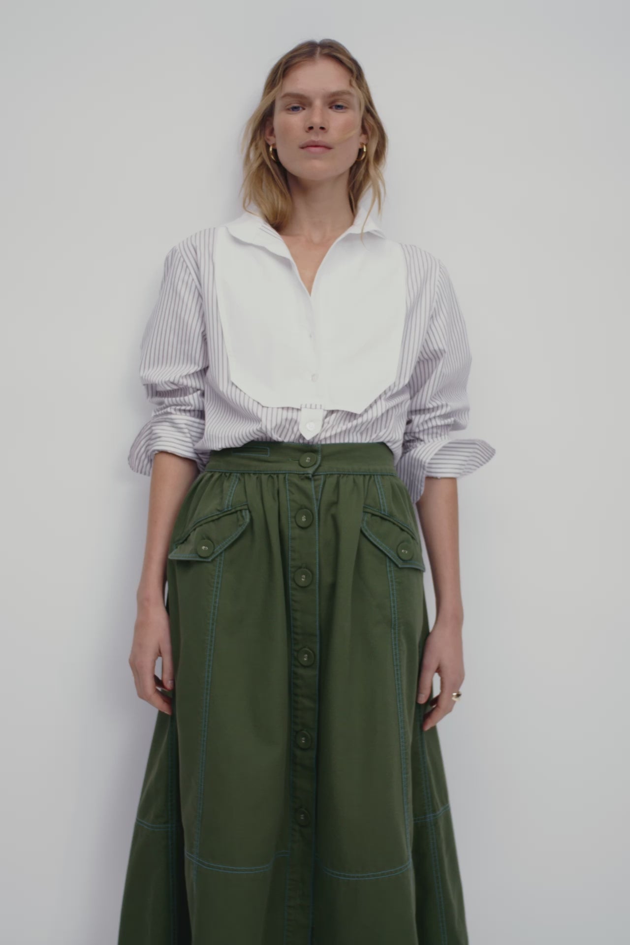 The Tab Shirt references our passion for the bib, combining masculine references with contrast cuffs and a workwear aesthetic playing with conventional norms and injecting a unique point of view. Tobacco and white stripes play nicely with the fresh white bib, collar & cuffs and will sit beautifully alongside a multitude of looks. A neutral anchor for so many looks. The secret is to cleverly play down feminine with a touch of the masculine.