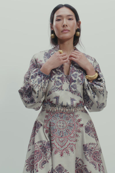 Created in luxurious silk twill, The Talitha Top drapes with a fluid elegance that feels as beautiful as it looks. Its intricate print is inspired by a vintage cloth we discovered and reimagined in a rich palette of jewel tones against a soft parchment base. Billowing sleeves and a relaxed silhouette give it a Bohemian ease, while the notched neckline and fine detailing elevate it to something truly special. Pair it back to The Scarf Skirt for the most beautiful co-ord.