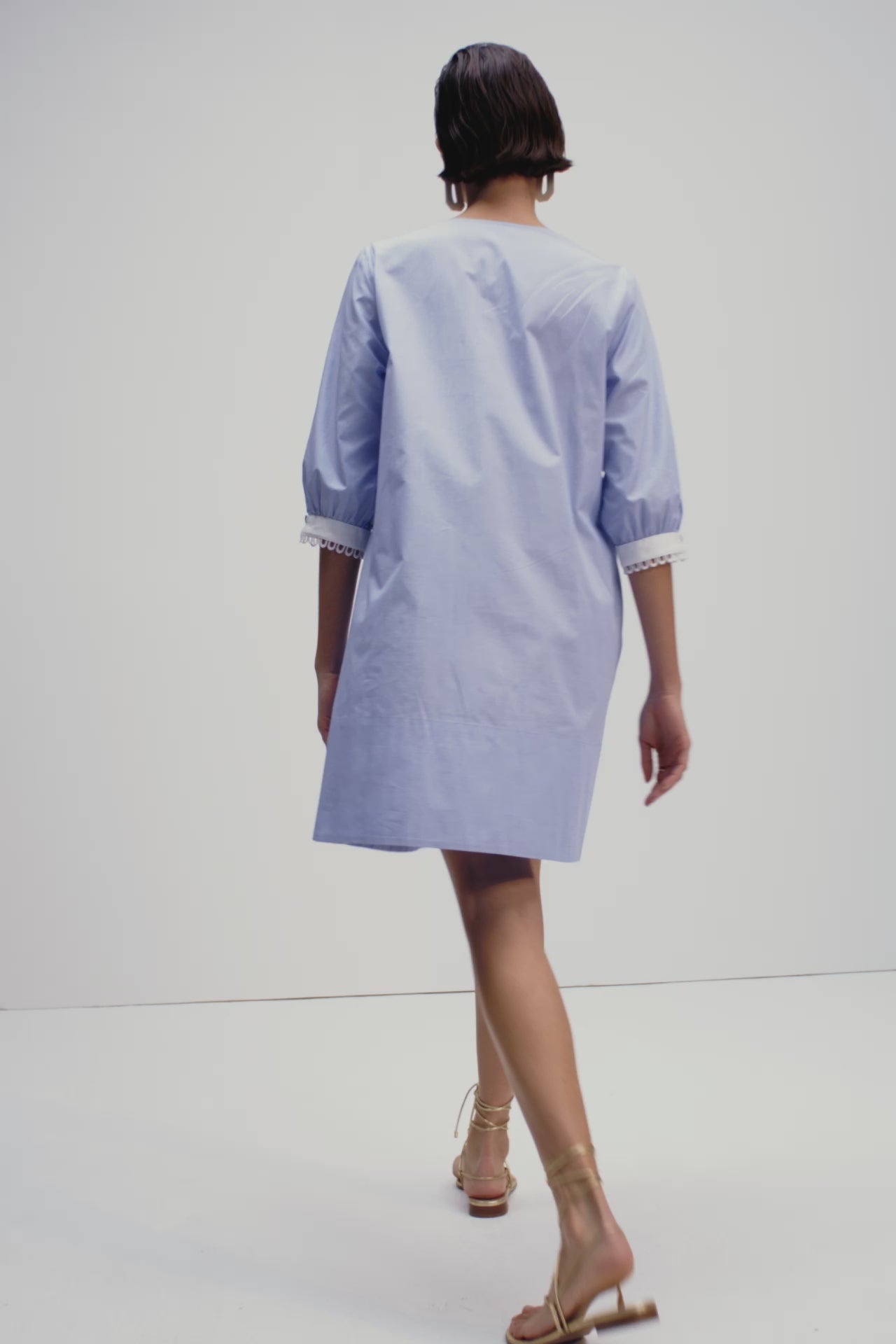 In celebration of 10 years of Wiggy Kit we are bringing back the first ever design we launched in 2015 but with a difference. Made of crisp and fresh blue shirting, white contrast bib and updated with "rouleau" type lace trim at the cuff and bib. Our bestselling shape is finally back in this limited edition dress. 3/4 lightly blouson sleeve, pockets and deep hem is a timeless silhouette designed to flatter. A true original and classic embodying the essence of Wiggy Kit and our ethos of hi/lo dressing.