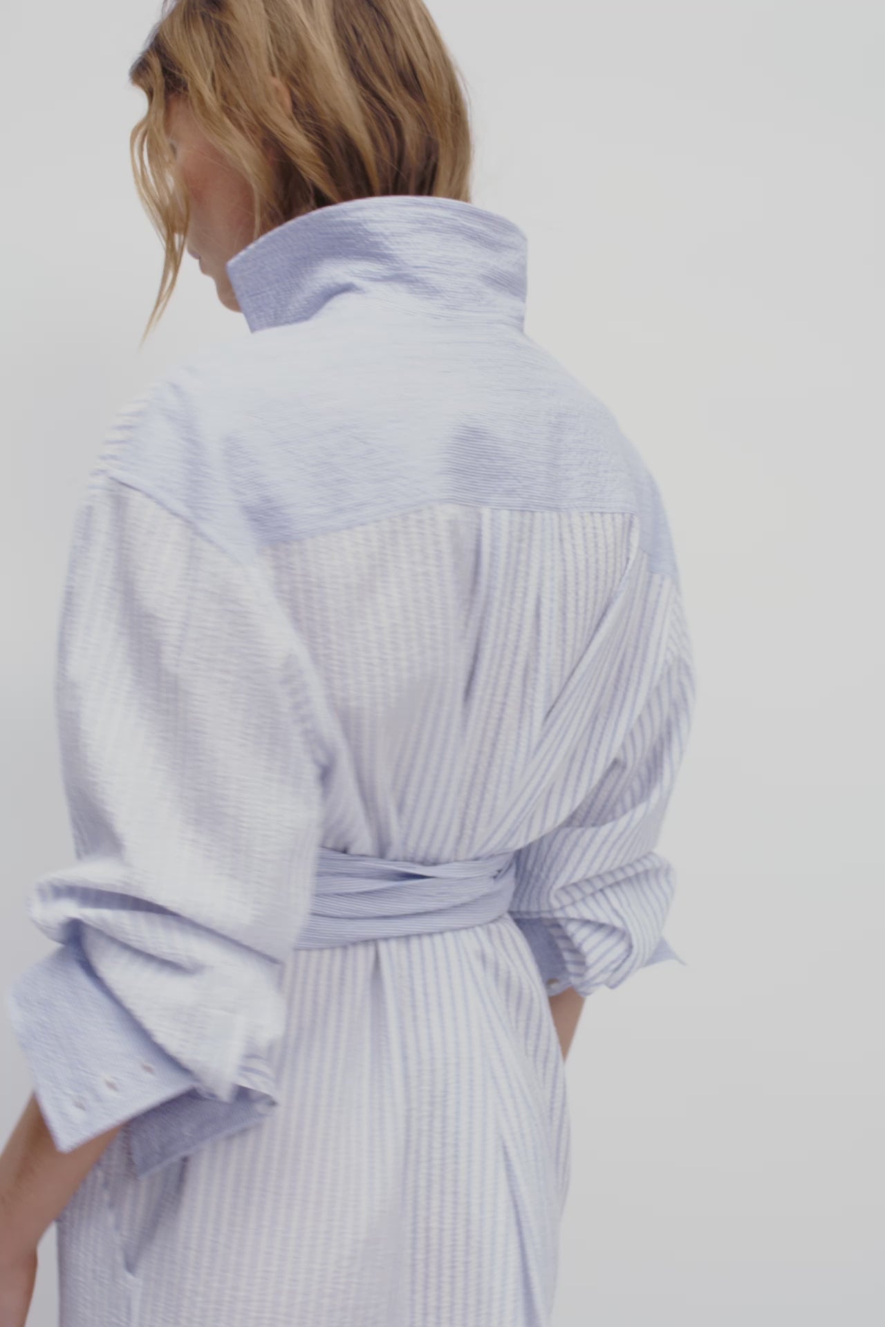 The Tom Tom Dress is a versatile popover dress that can be worn loose or belted. It features a wide placket, generous pockets, shirt tail hem and a slouchy but super flattering shape. Two contrasting but complimentary striped seersuckers are used to great effect making this a fresh classic for summer.