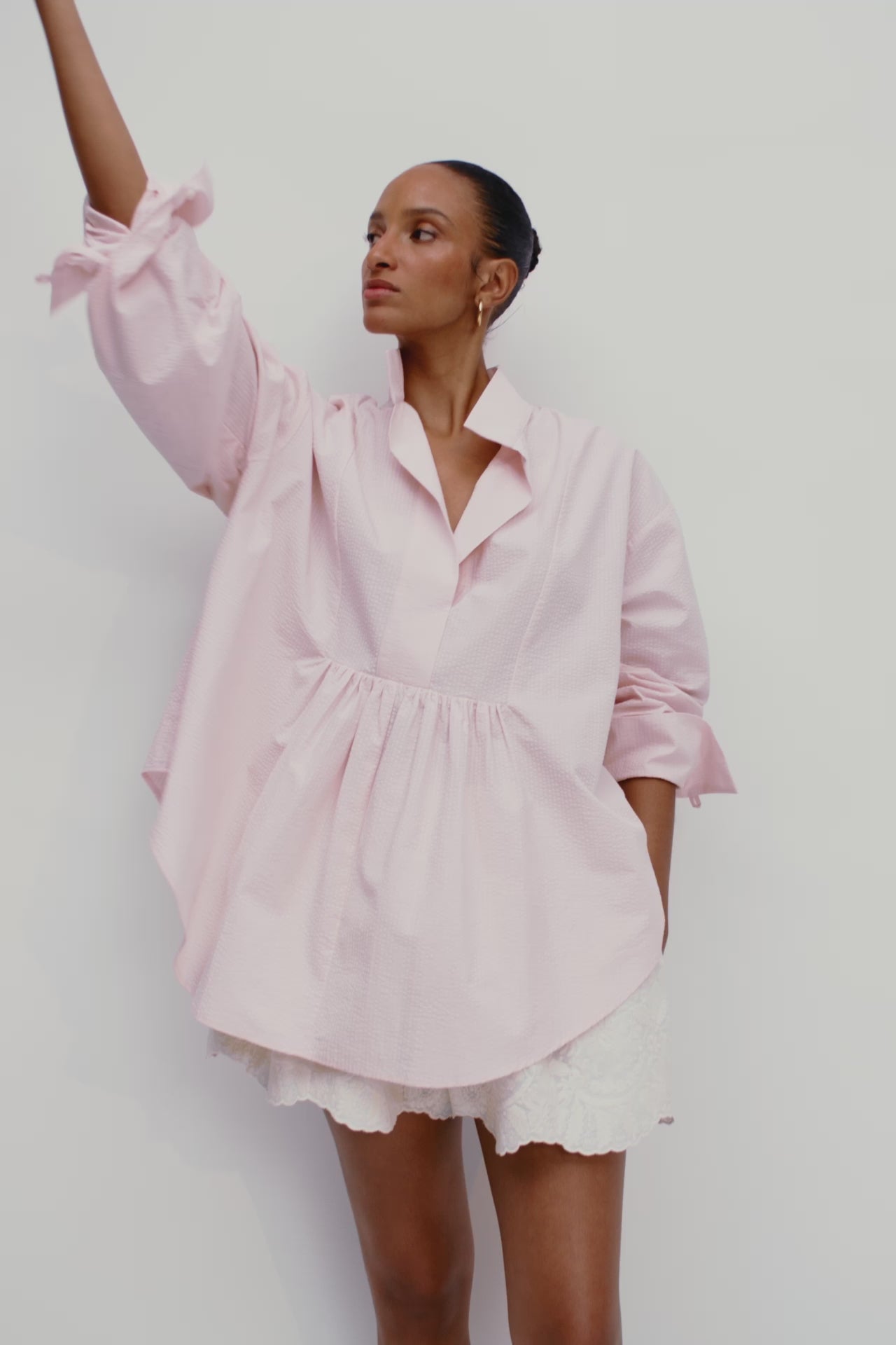 Our Icon Is Back. This 'borrowed from your boyfriend' pink cotton shirt has an understated slouchy sensuality. The straight collar and deep slashed front placket is buttonless but tacked which cleverly reveals just enough. Oversized with an insouciant edge and both feminine and yet masculine.